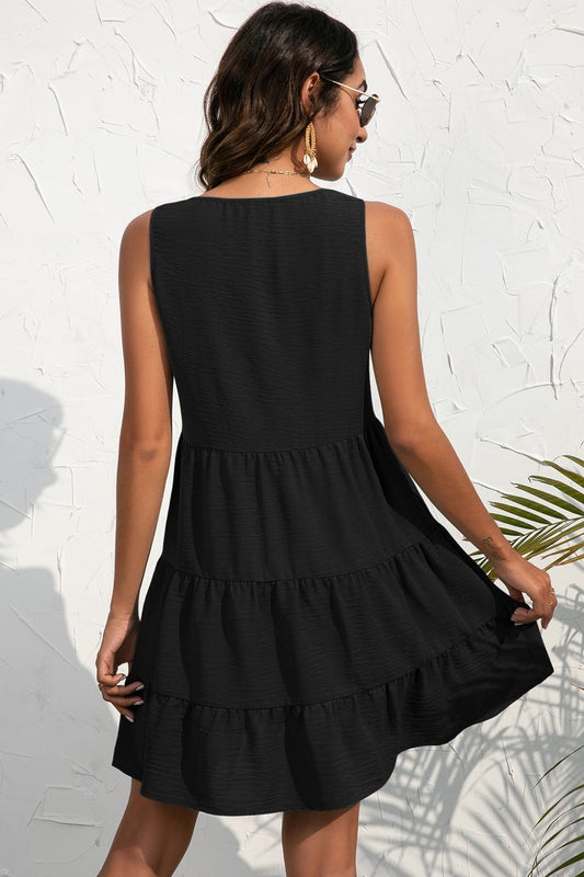 Decorative Button V-Neck Tiered Sleeveless Dress