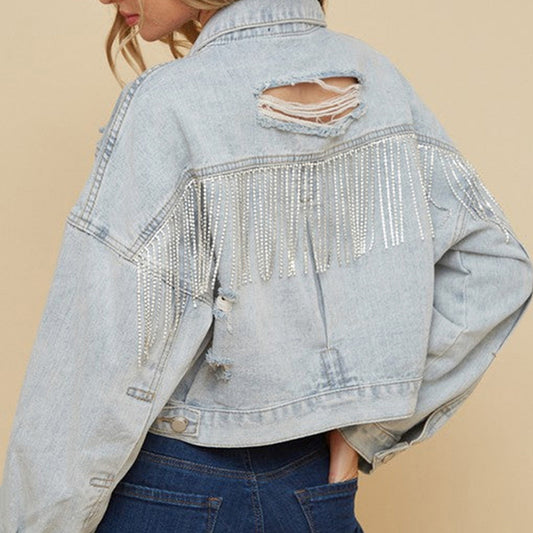 Fringe Detail Long Sleeve Cropped Denim Jacket