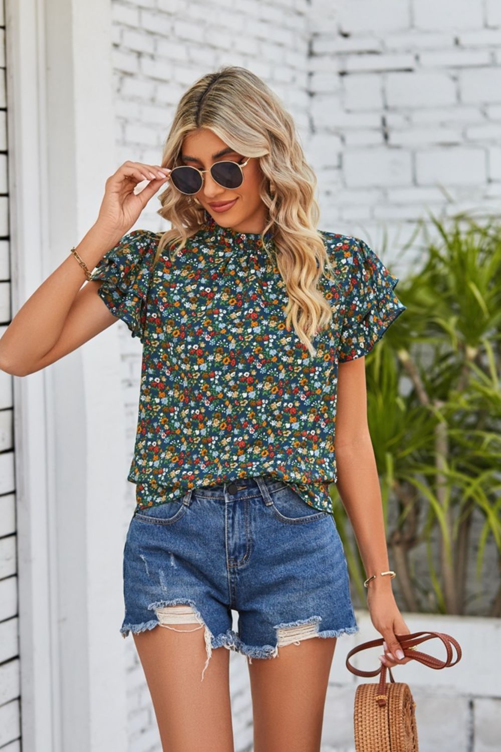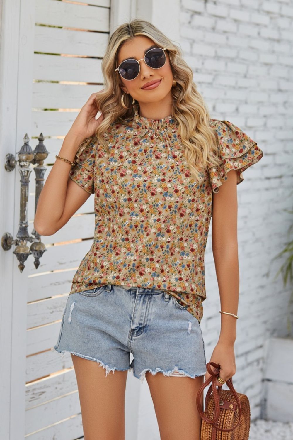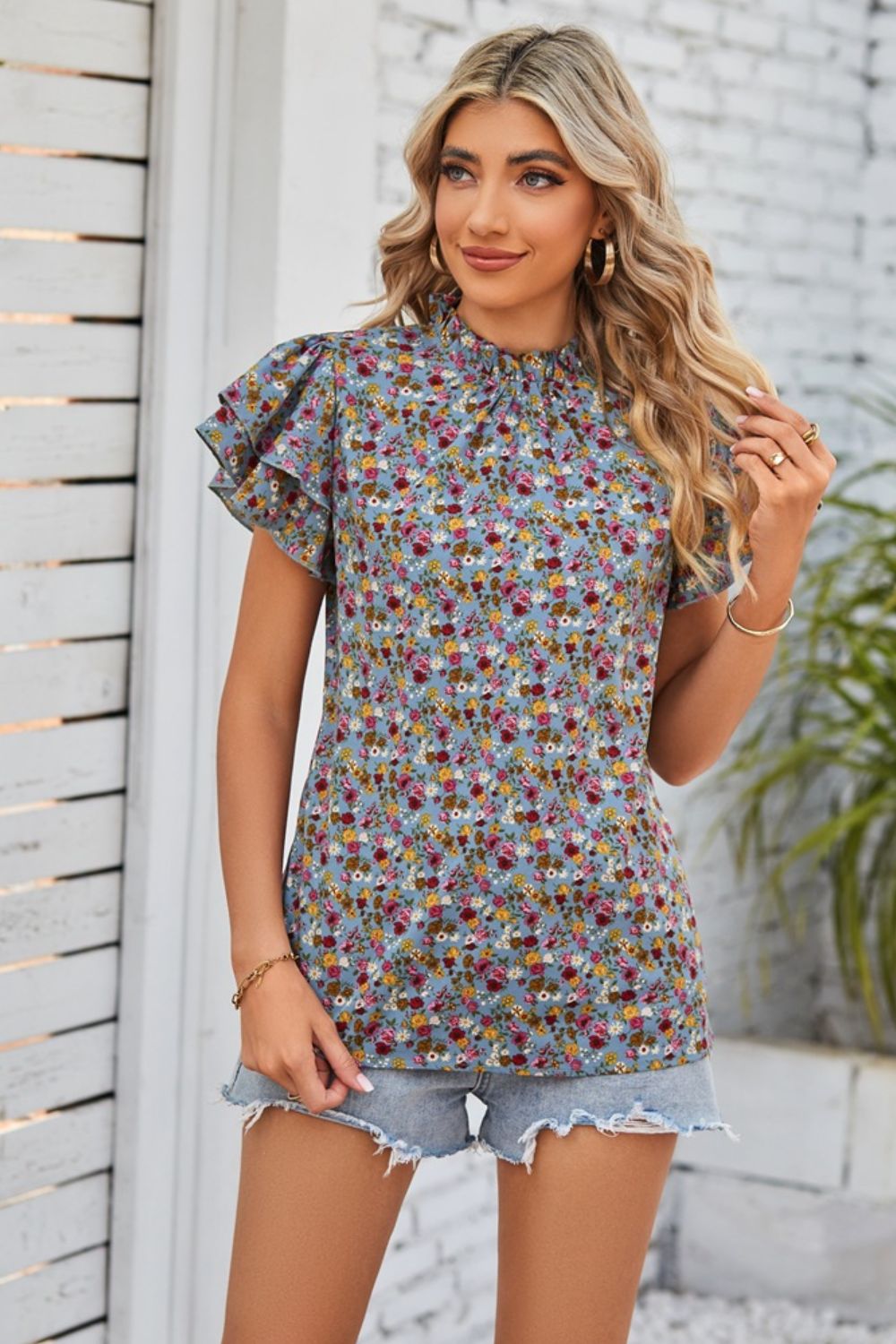 Floral Ruffle Collar Flutter Sleeve Blouse