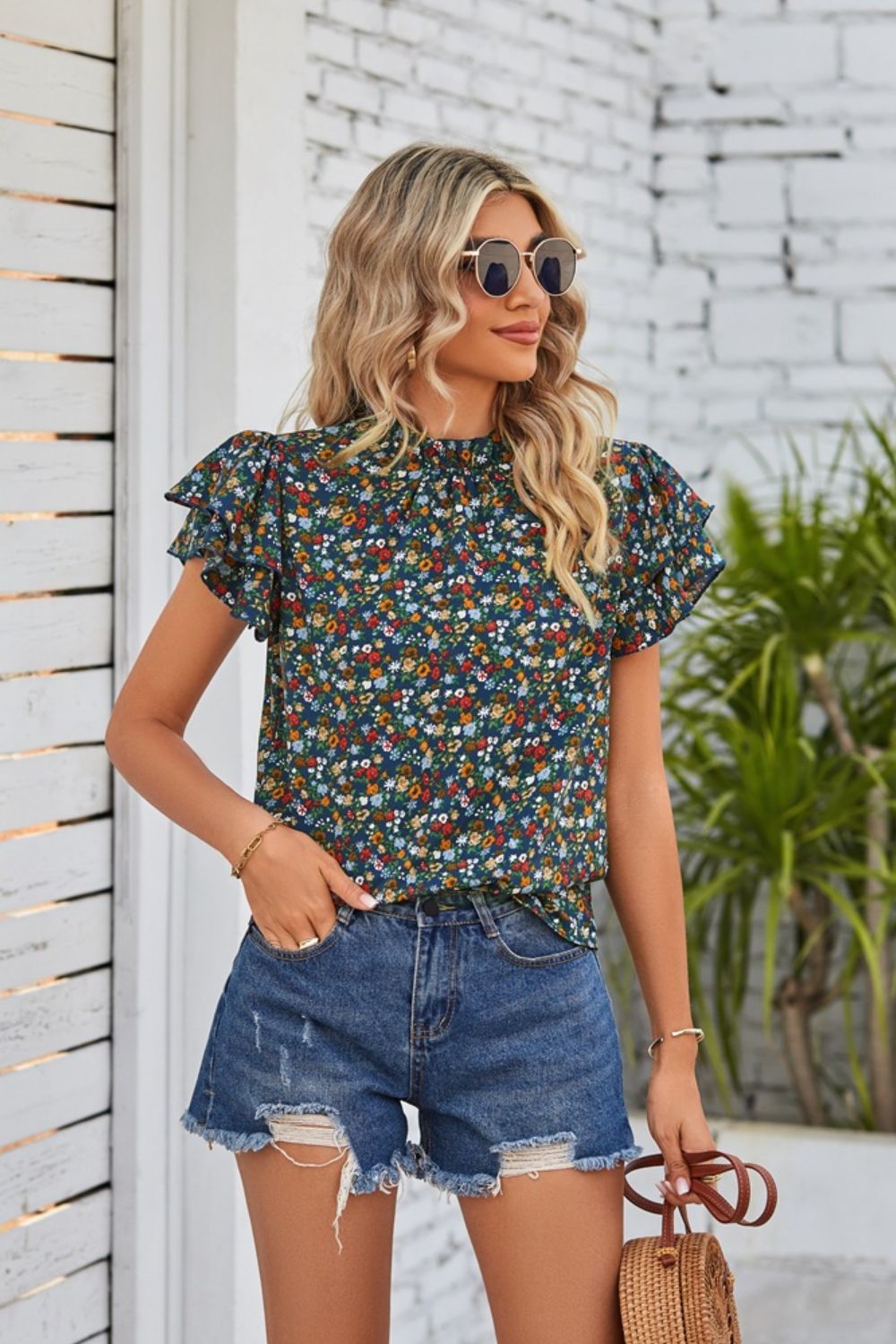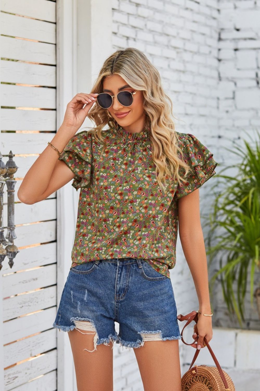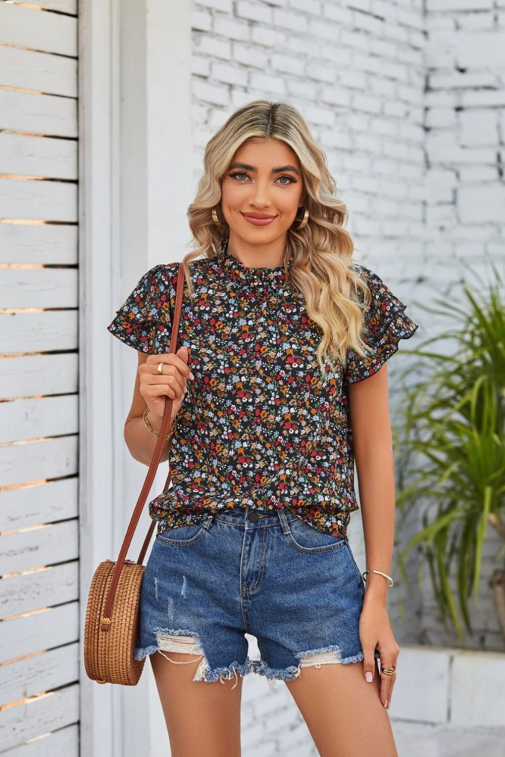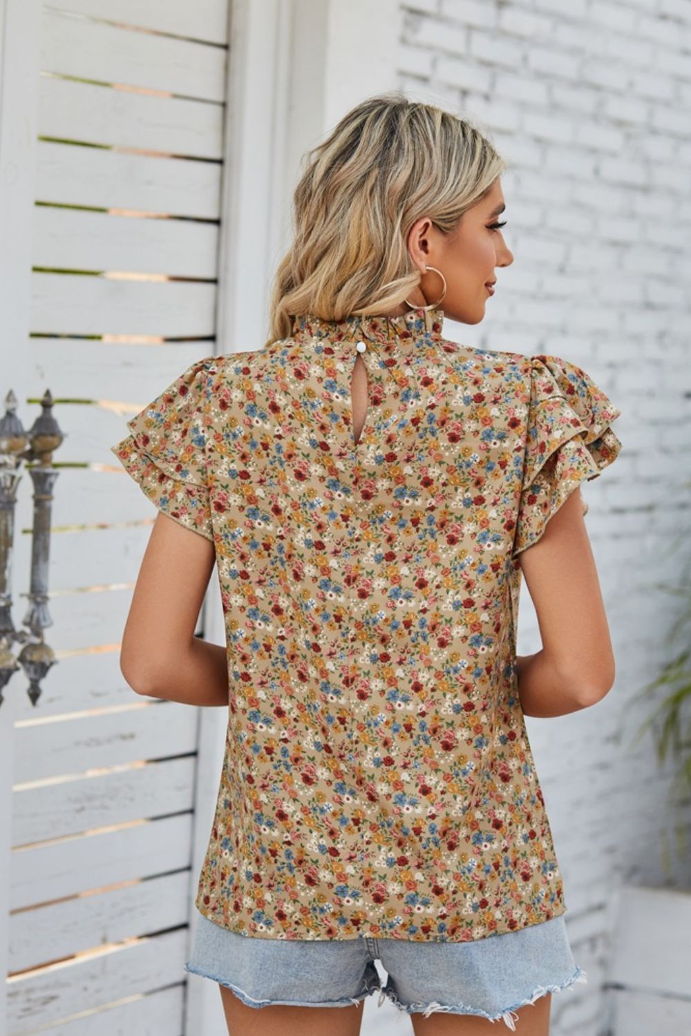Floral Ruffle Collar Flutter Sleeve Blouse