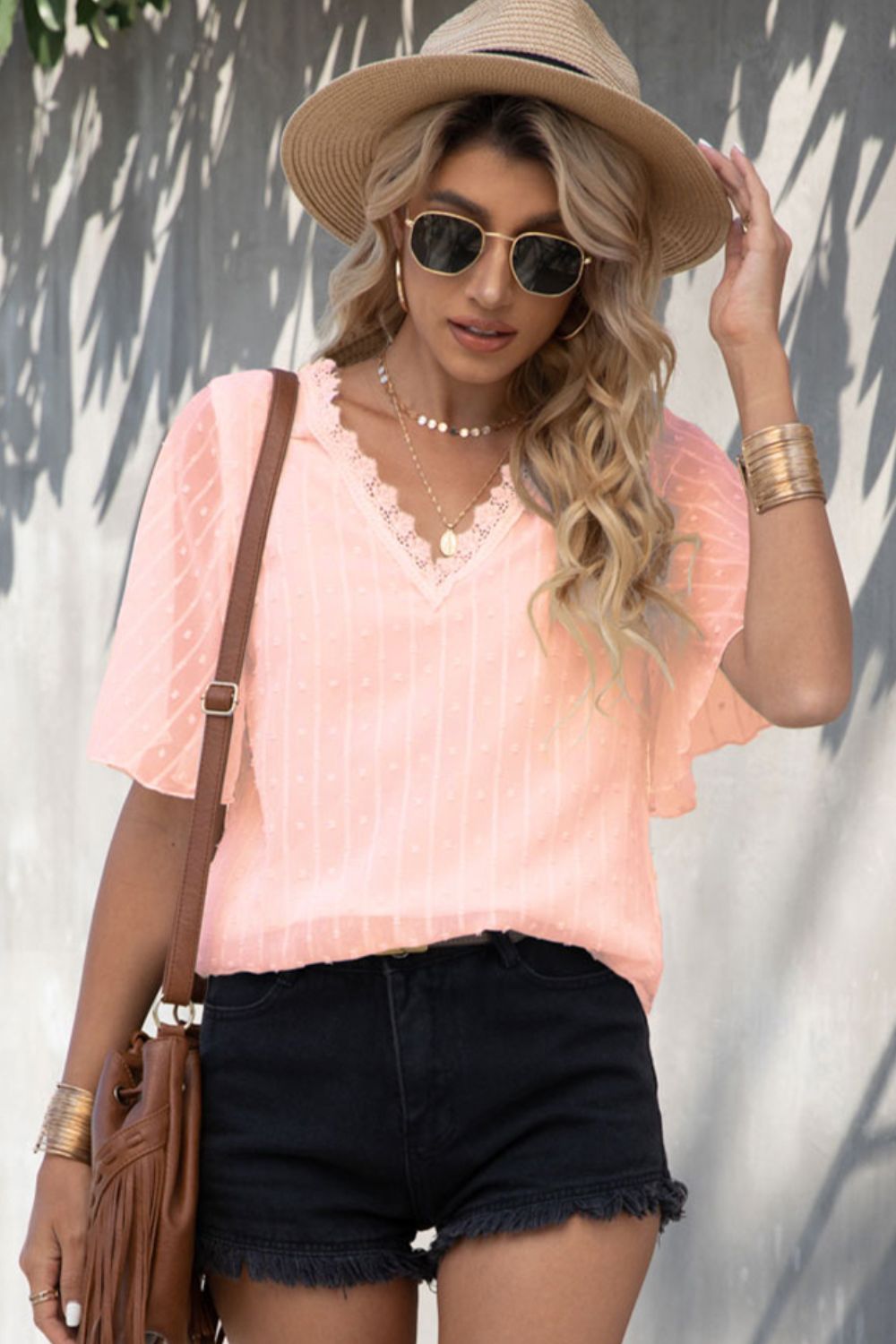Swiss Dot Lace Trim Flutter Sleeve V-Neck Blouse